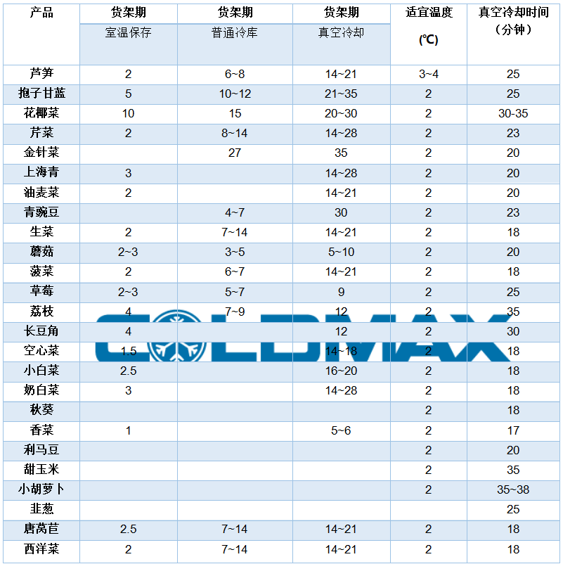 生鮮果蔬真空預冷、氣調(diào)包裝和普通冷藏保質(zhì)期對比表(單位:天)