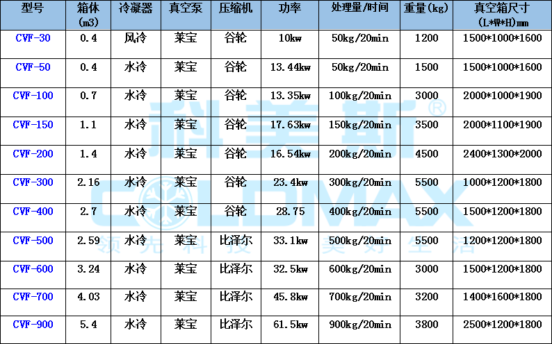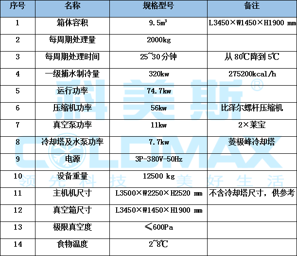 CVF-2000 型號(hào)食品快速冷卻機(jī)每周期處理食品量為2000kg,處理時(shí)間10~20分鐘;