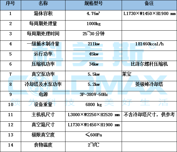 CVF-1000 型號(hào)食品快速冷卻機(jī)每周期處理食品量為1000kg,處理時(shí)間10~20分鐘;