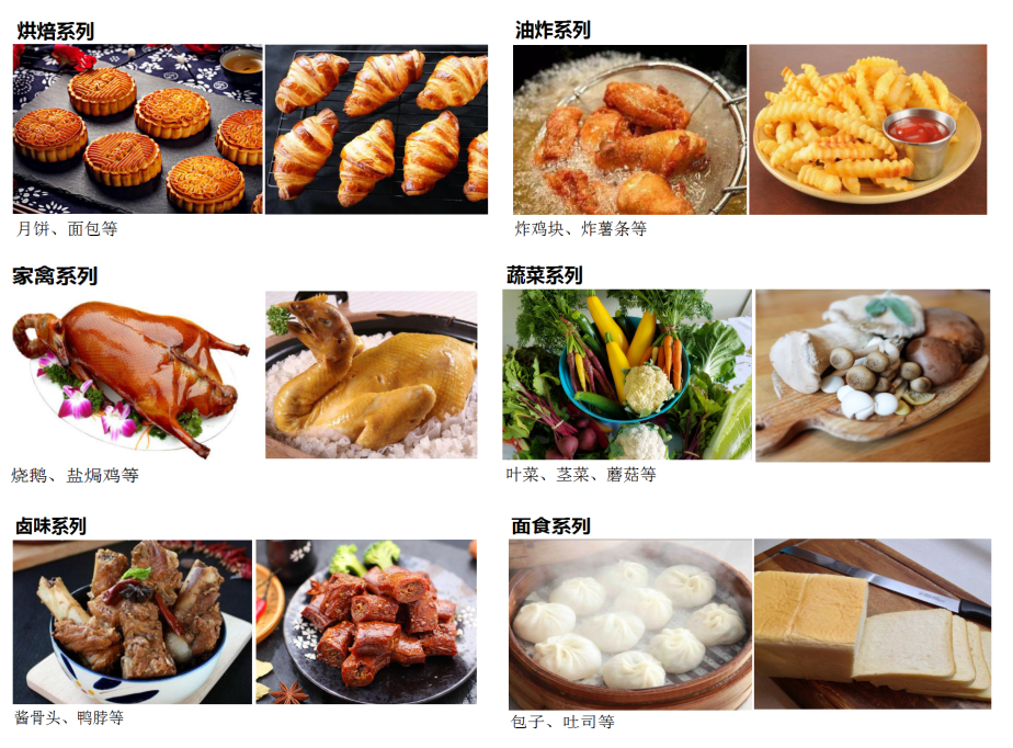 各類蔬菜、食用菌、食品陷料、月餅餡、面包等;