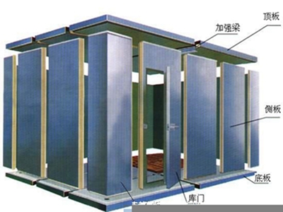 庫板厚一般采用150mm、200mm,板內(nèi)填充聚氨脂保溫材料,雙面為涂塑彩鋼板或不銹鋼板,彩鋼板面加工成隱形槽,其重量輕,強度高、隔熱性能好, 耐腐蝕、抗老化,該庫板拼裝簡便快捷,是冷庫保溫庫體選擇的優(yōu)選材料之一。