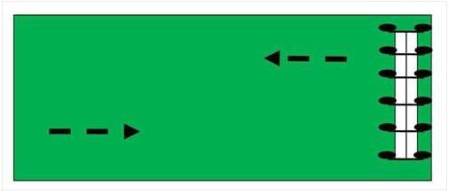 標(biāo)準(zhǔn)平移機(jī)運(yùn)行示意設(shè)備運(yùn)行軌跡是平行移動(dòng)式,中心點(diǎn)和所有跨體平行移動(dòng),水流從中心點(diǎn)經(jīng)過機(jī)身上均勻分布的噴頭對(duì)地面進(jìn)行灌溉,適合長(zhǎng)條形地塊地灌溉。一般地塊的長(zhǎng)度比超過 3:1,且地塊平坦時(shí)使用。設(shè)備跨體尺寸長(zhǎng)度不超過 1200 米。設(shè)備長(zhǎng)度上限與設(shè)備種類、供水、供電及導(dǎo)向方式相關(guān)。