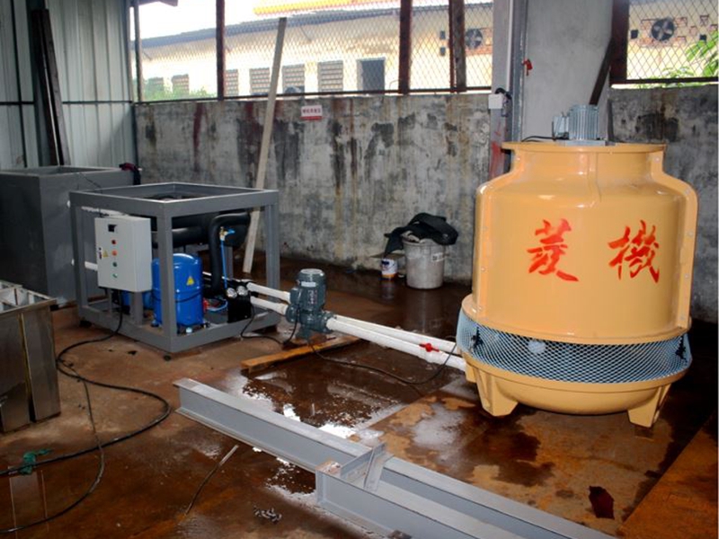 冰瓶機通常使用鹽水間接式制冷。將裝有水的塑料瓶放入鹽水池中,蓋上鹽水池蓋板,設備啟動后,制冷機組開始運行;塑料瓶中的水先于鹽水池中的鹽水凝結成冰,從而實現(xiàn)冰瓶的制作。