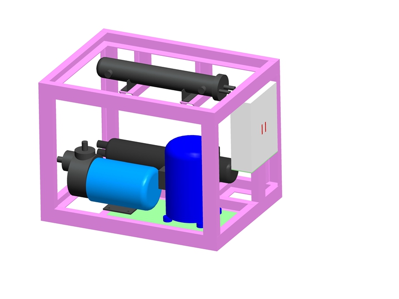 冰瓶機通常使用鹽水間接式制冷。將裝有水的塑料瓶放入鹽水池中,蓋上鹽水池蓋板,設備啟動后,制冷機組開始運行;塑料瓶中的水先于鹽水池中的鹽水凝結(jié)成冰,從而實現(xiàn)冰瓶的制作。