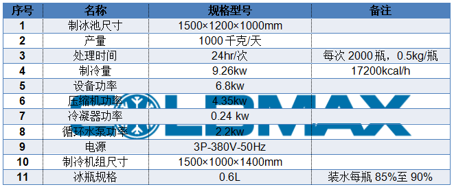 產(chǎn)品介紹冰瓶機是制冰機中的一種,與其它制冰機相比,區(qū)別在于生產(chǎn)出的冰是裝在塑料瓶中,主要用于需要冷卻但不允許帶入融化水的特殊場合,用的最多是在蔬菜運輸過程中的保鮮。廣泛應用于工廠降溫、長途運輸、水產(chǎn)食品保鮮、水果蔬菜保鮮、特殊領(lǐng)域的降溫冷卻等CIB-1.0W 型號冰瓶機日產(chǎn)量:1.0T 2000瓶;工作原理冰瓶機通常使用鹽水間接式制冷。將裝有水的塑料瓶放入鹽水池中,蓋上鹽水池蓋板,設備啟動后,制冷